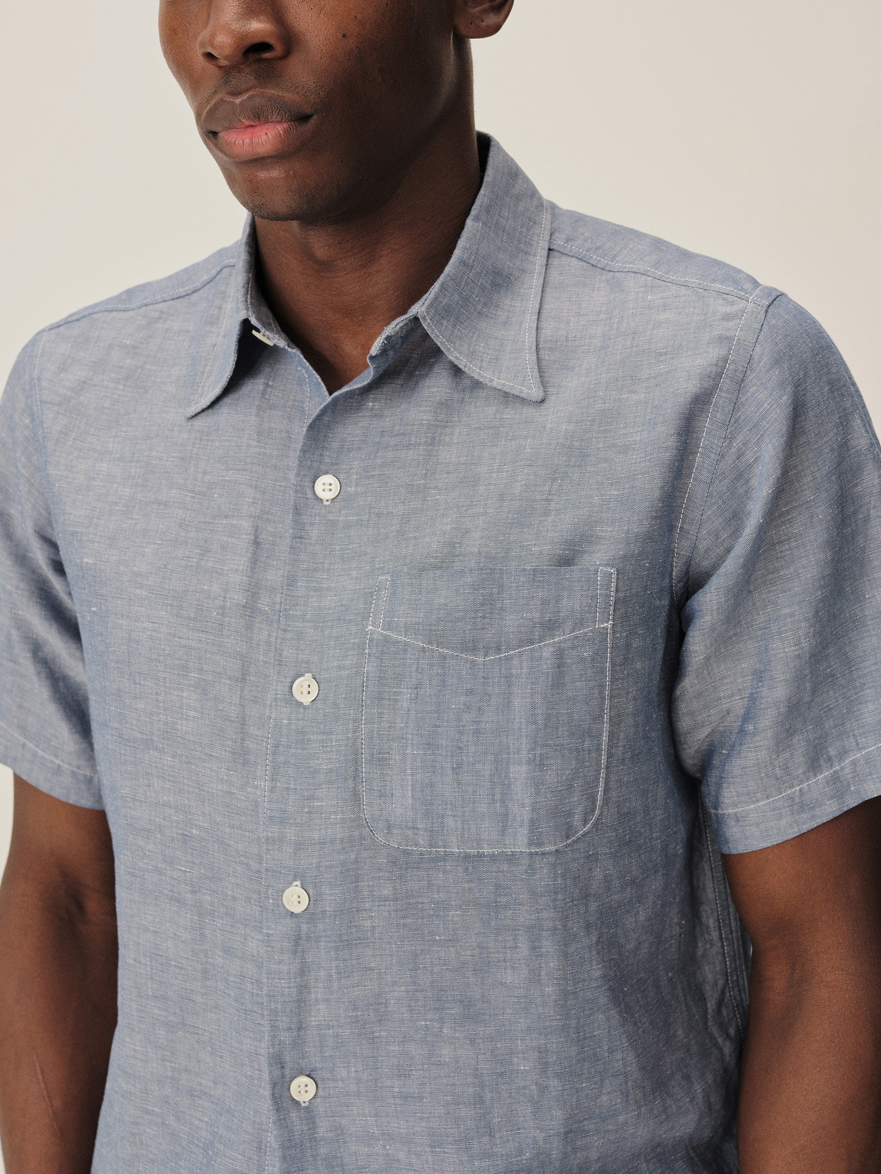 A midcentury-inspired button-up with a perfectly proportioned point collar, single chest pocket, and a curved hem.