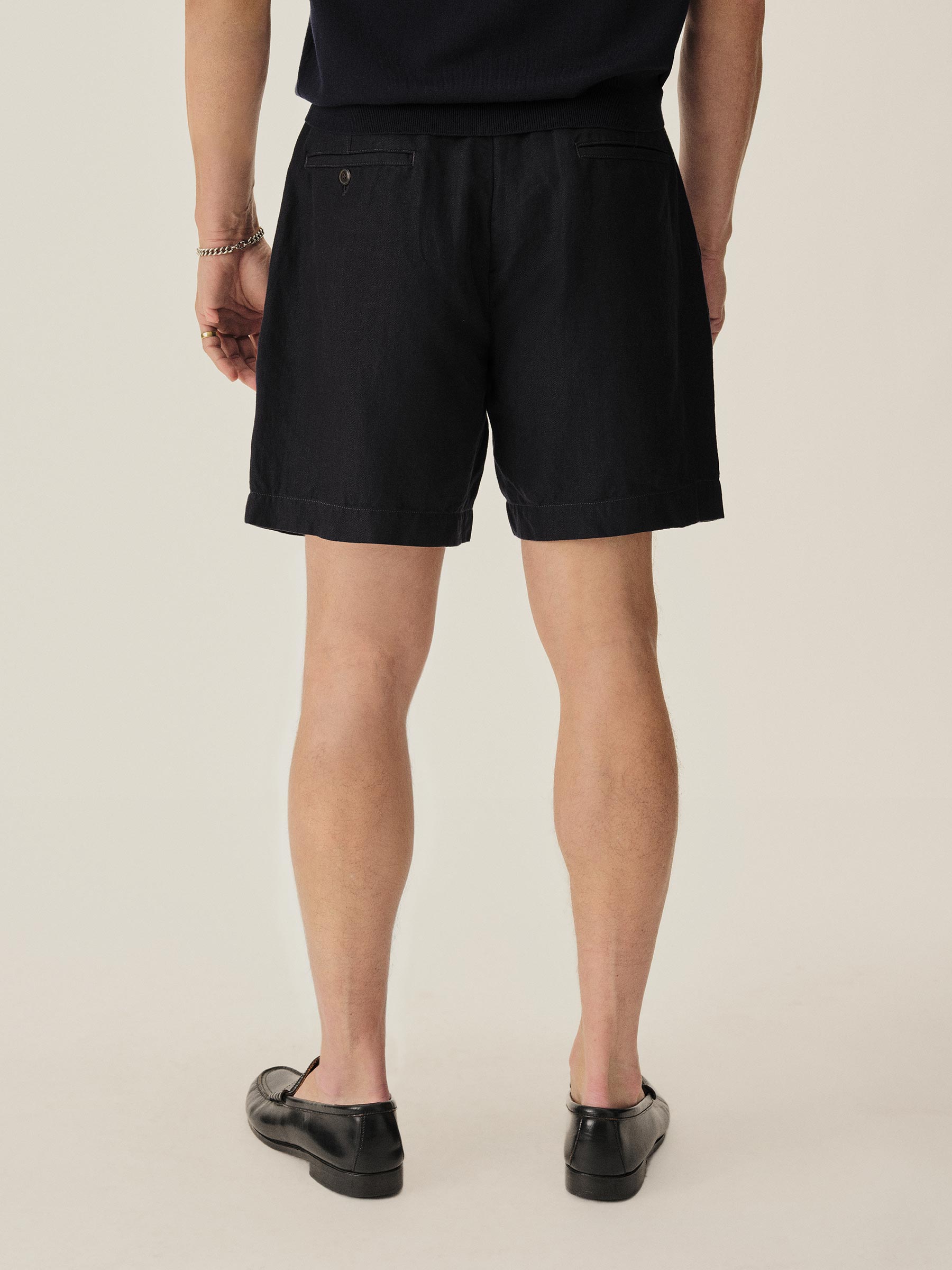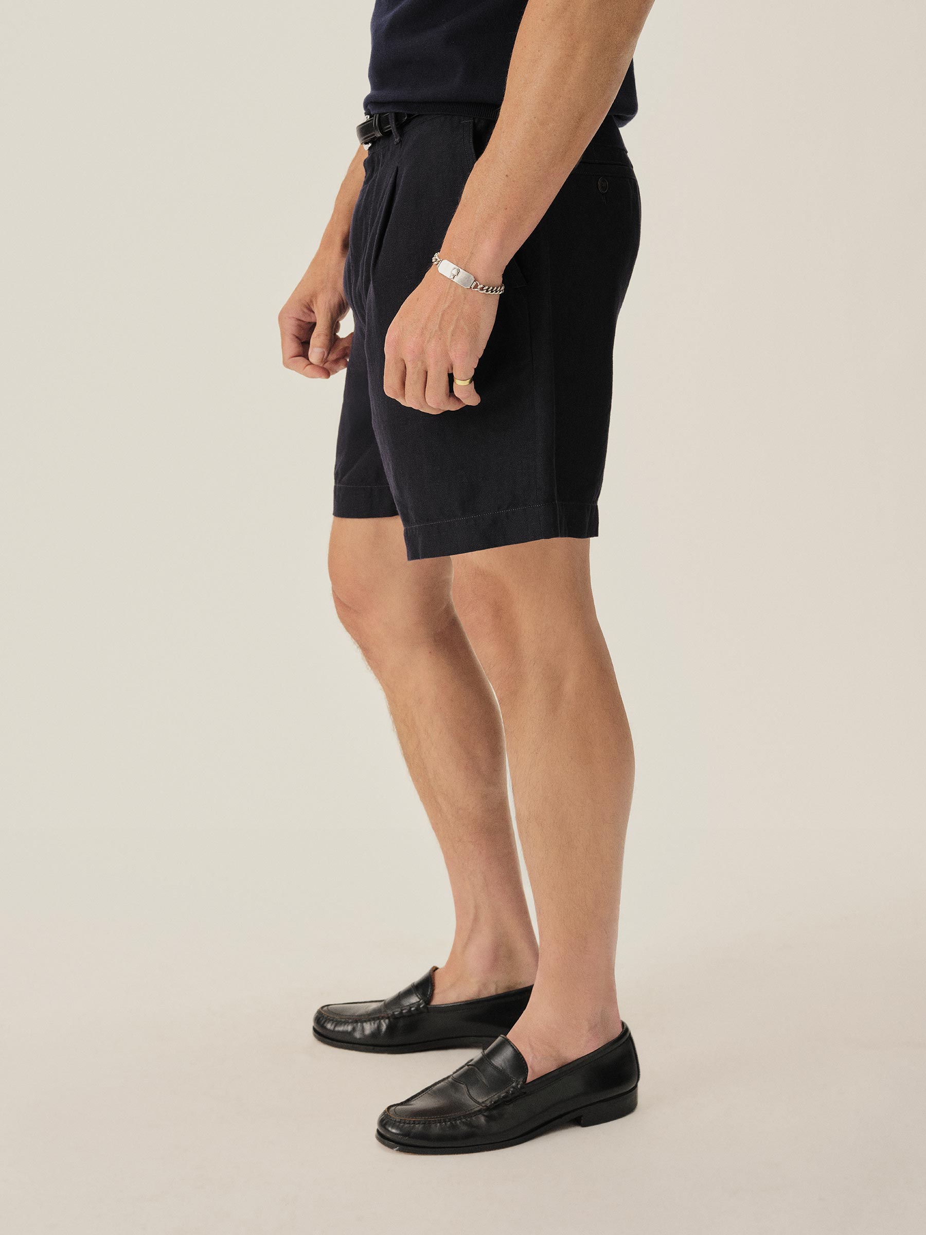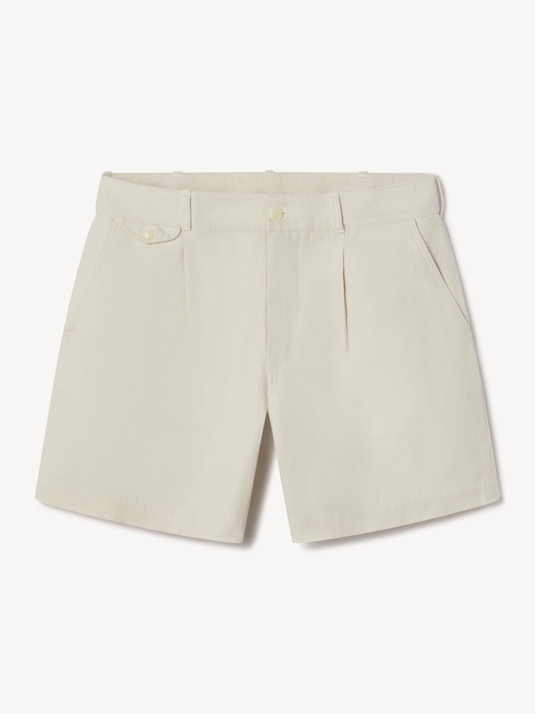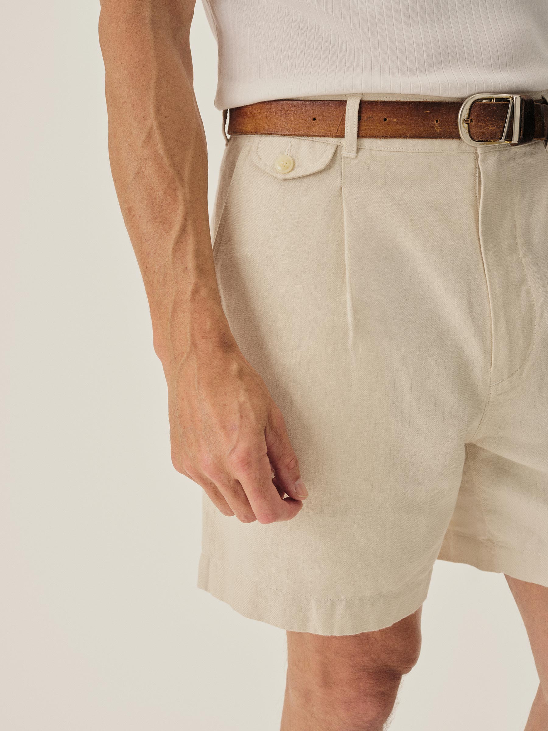 A tailored, pleated short with classic roots, cut from breathable cotton-linen herringbone for a lived-in feel.