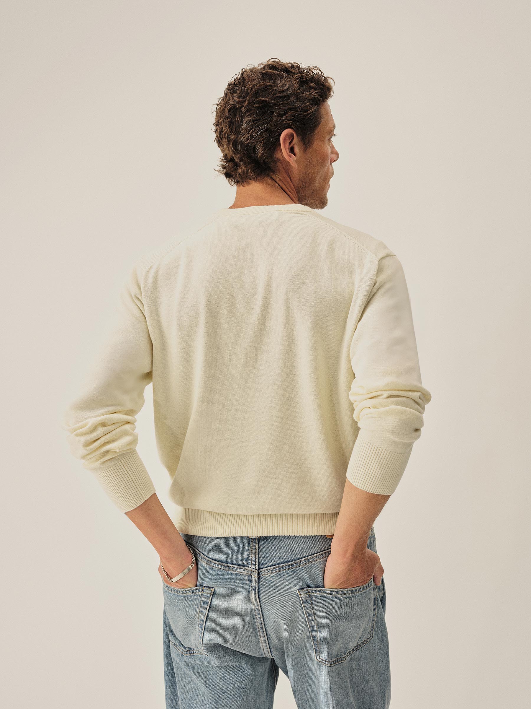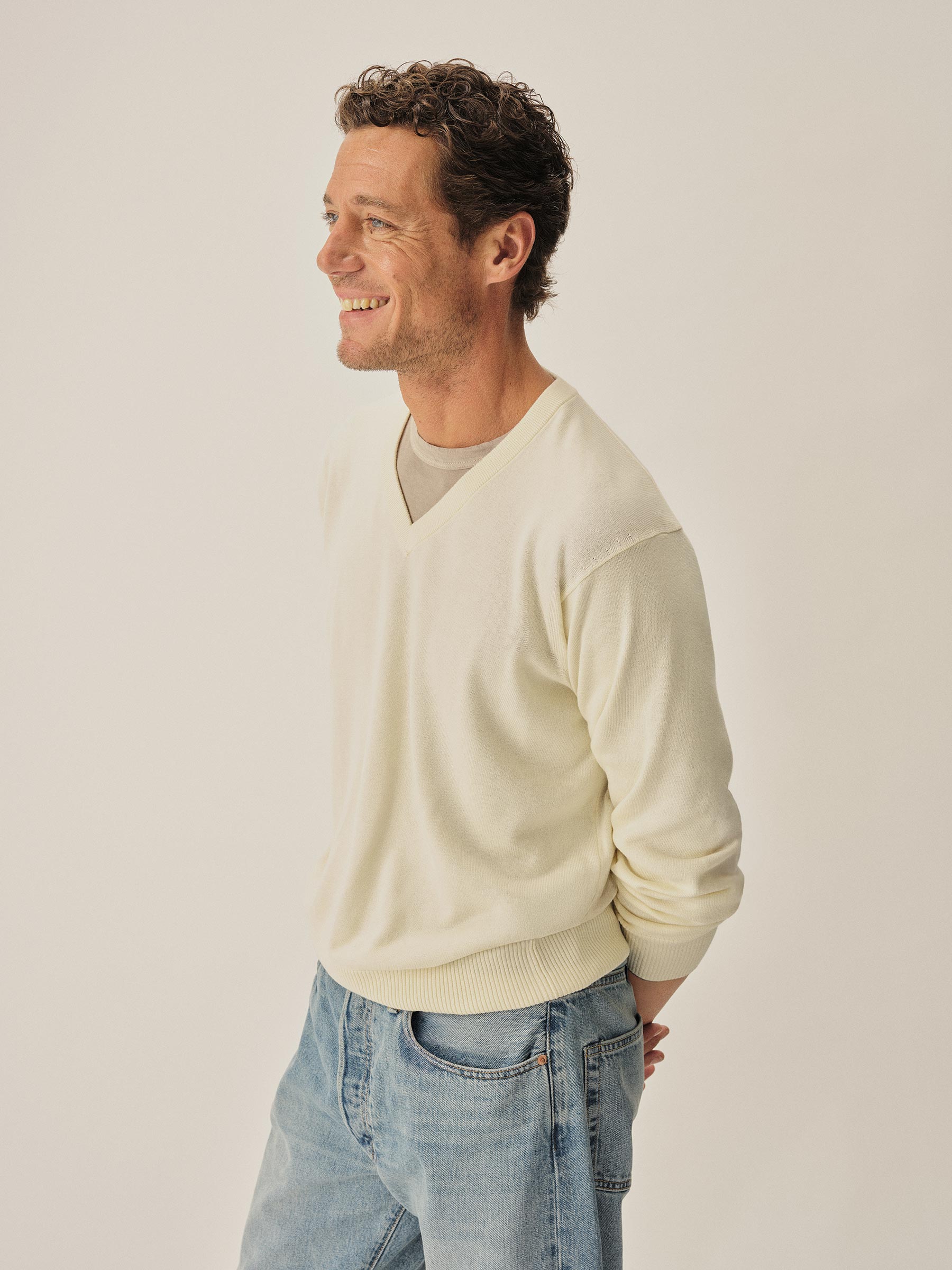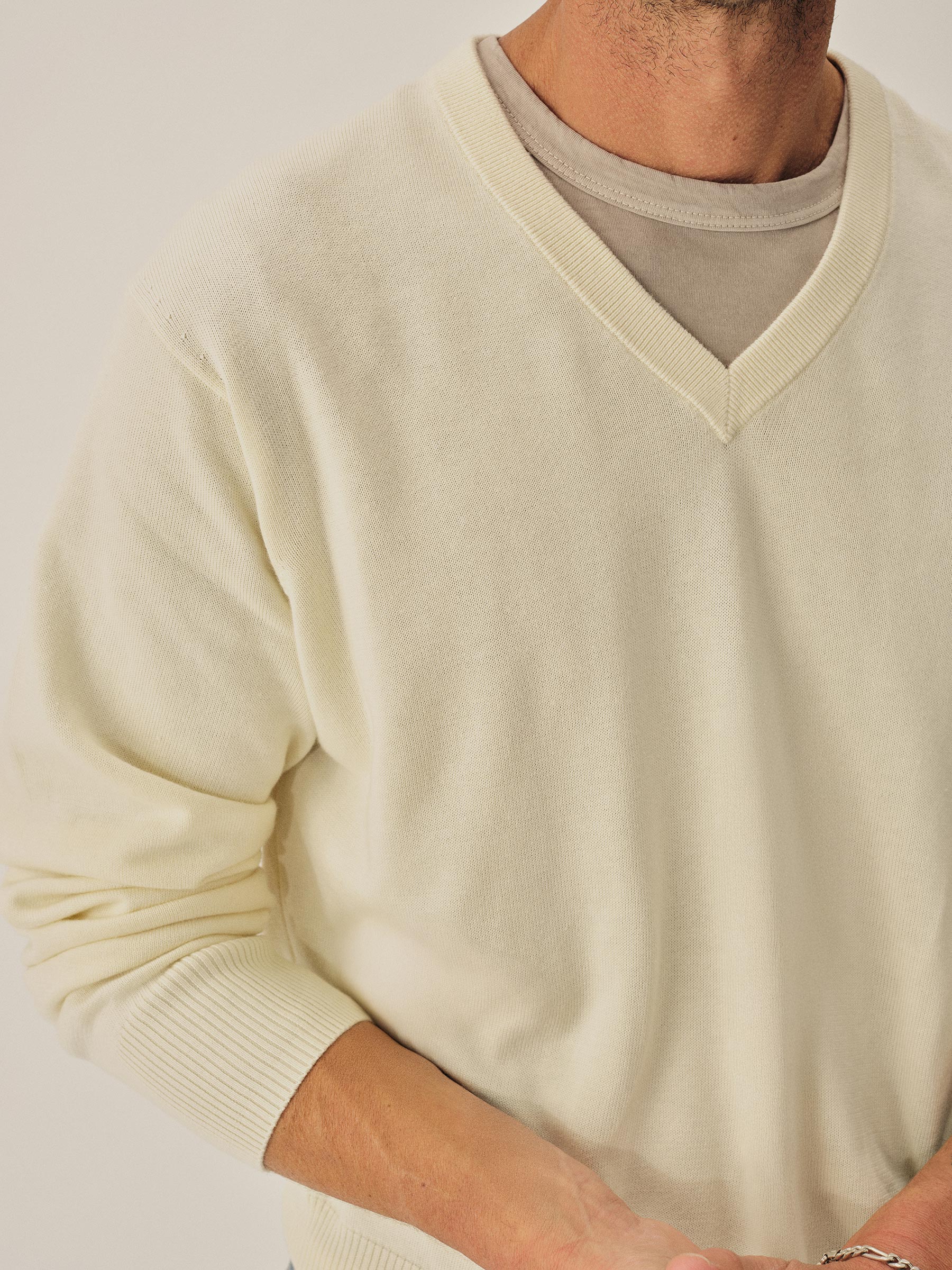 Classic fit V-neck sweater, fully fashioned from an ultrafine blend of organic Egyptian cotton and cashmere, spun in Italy.