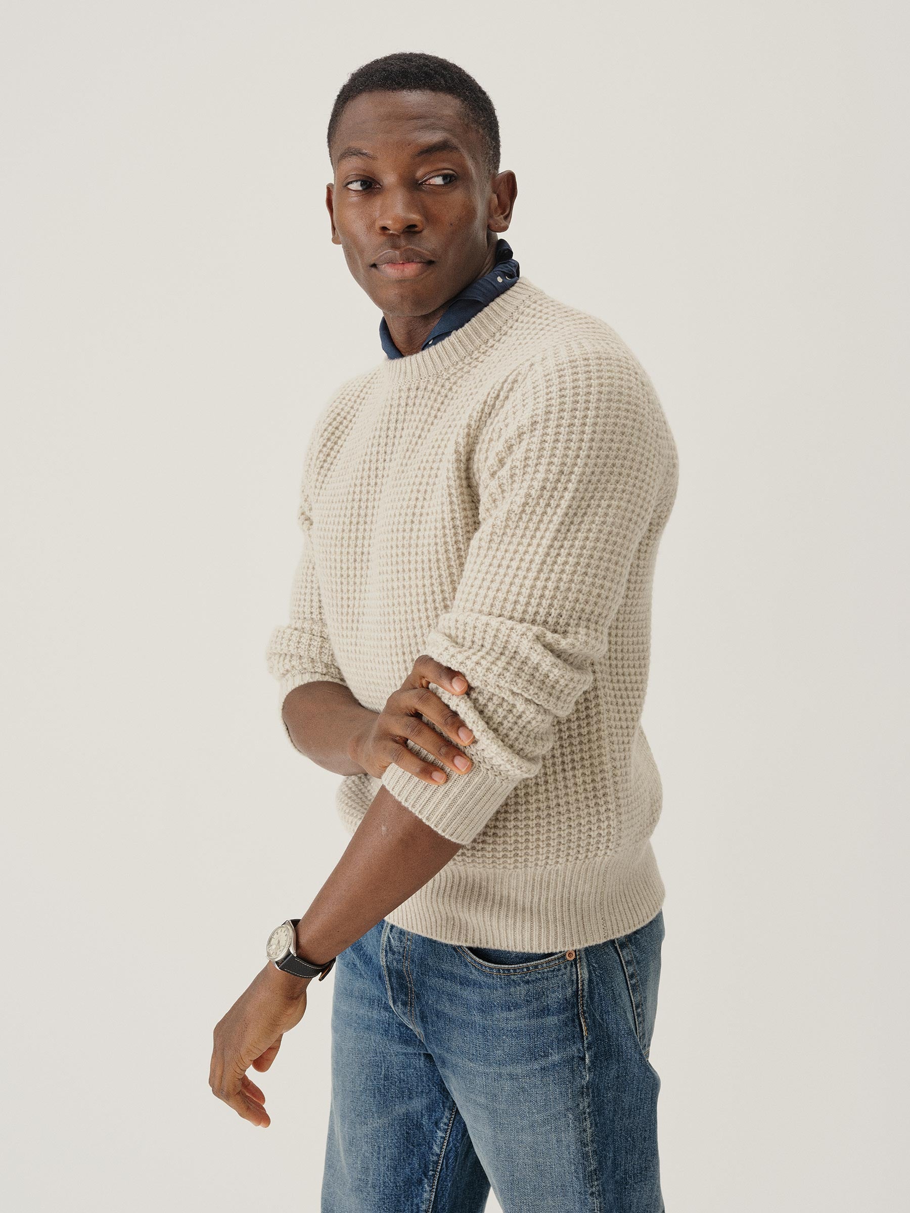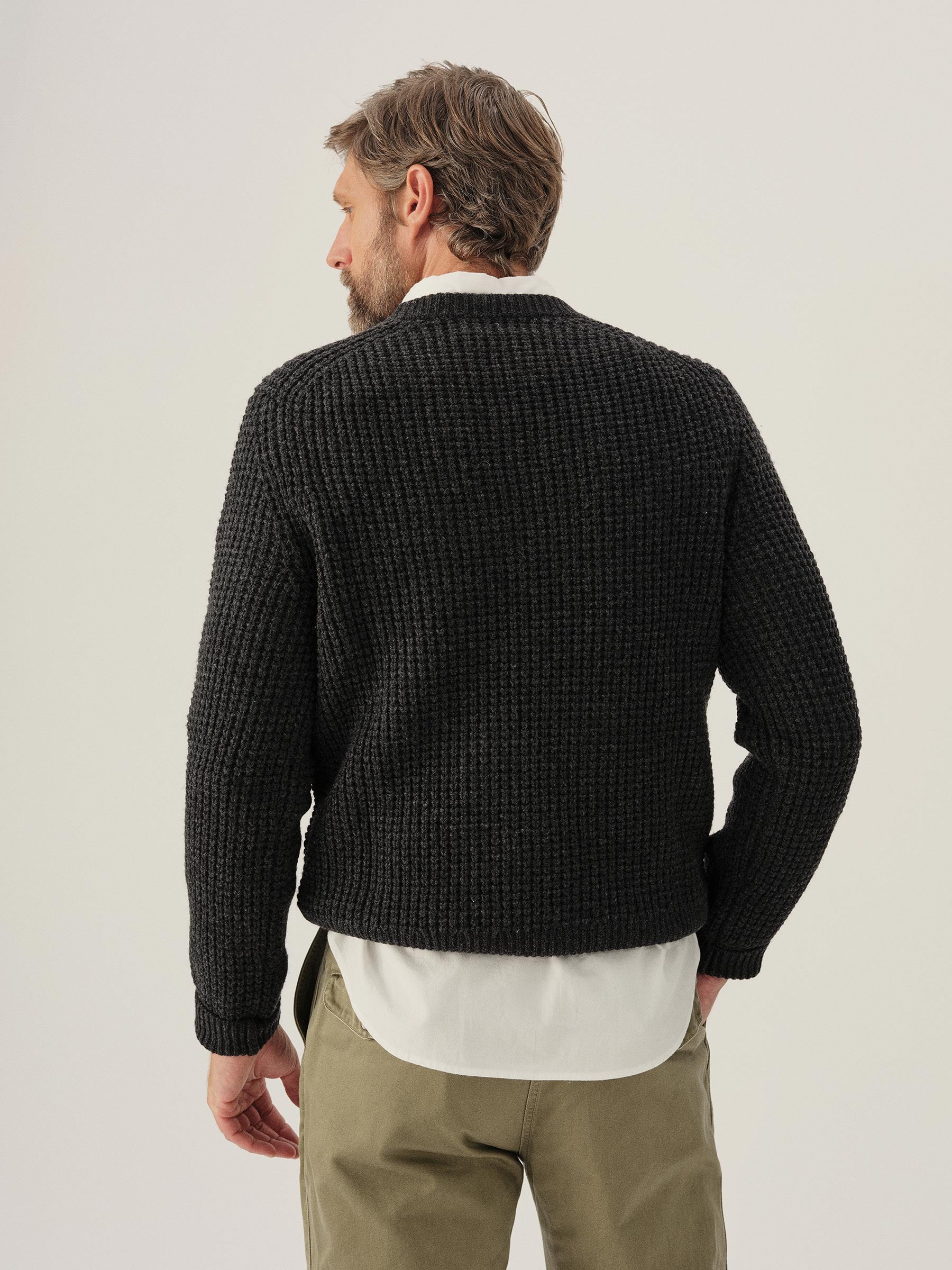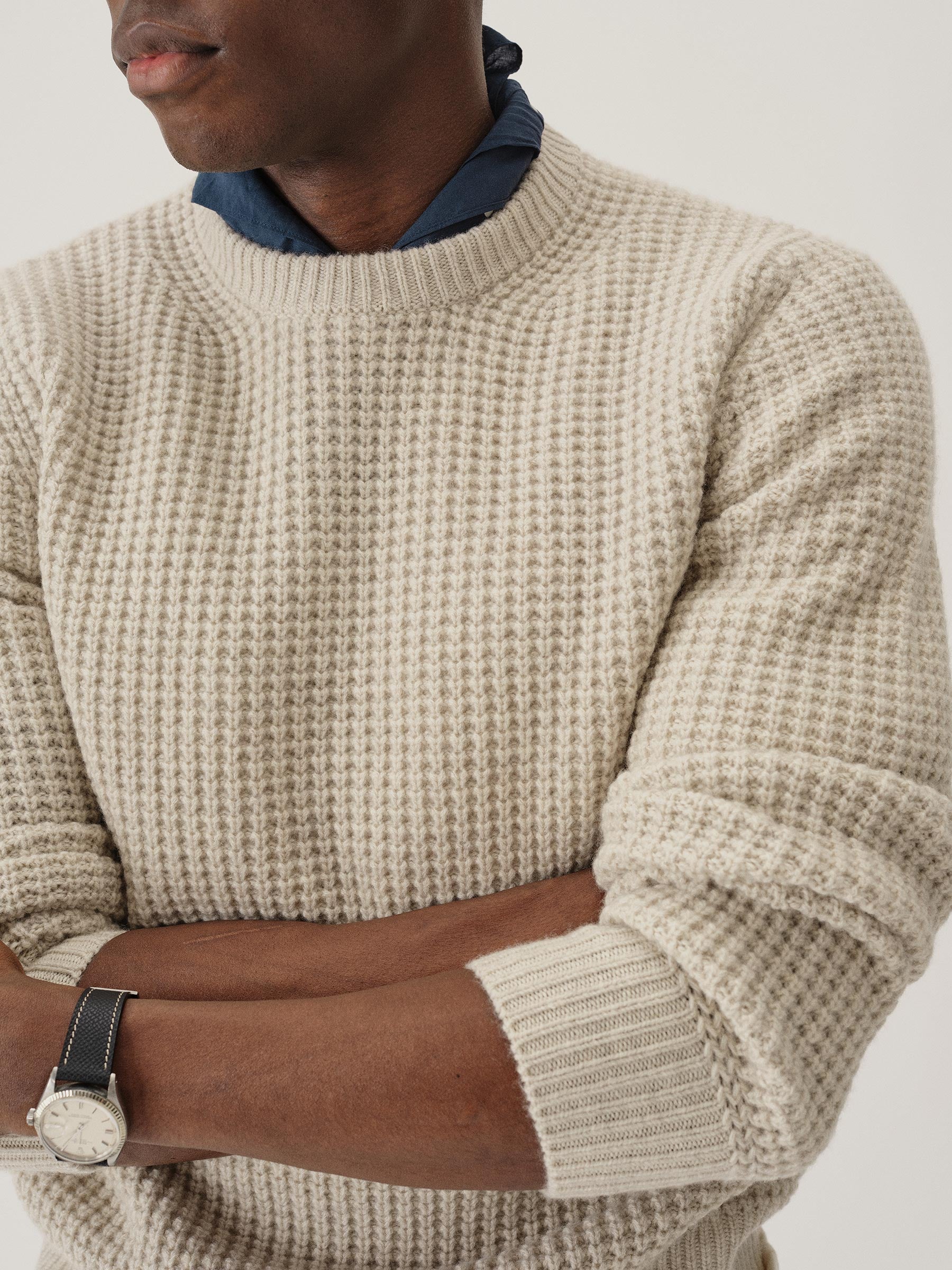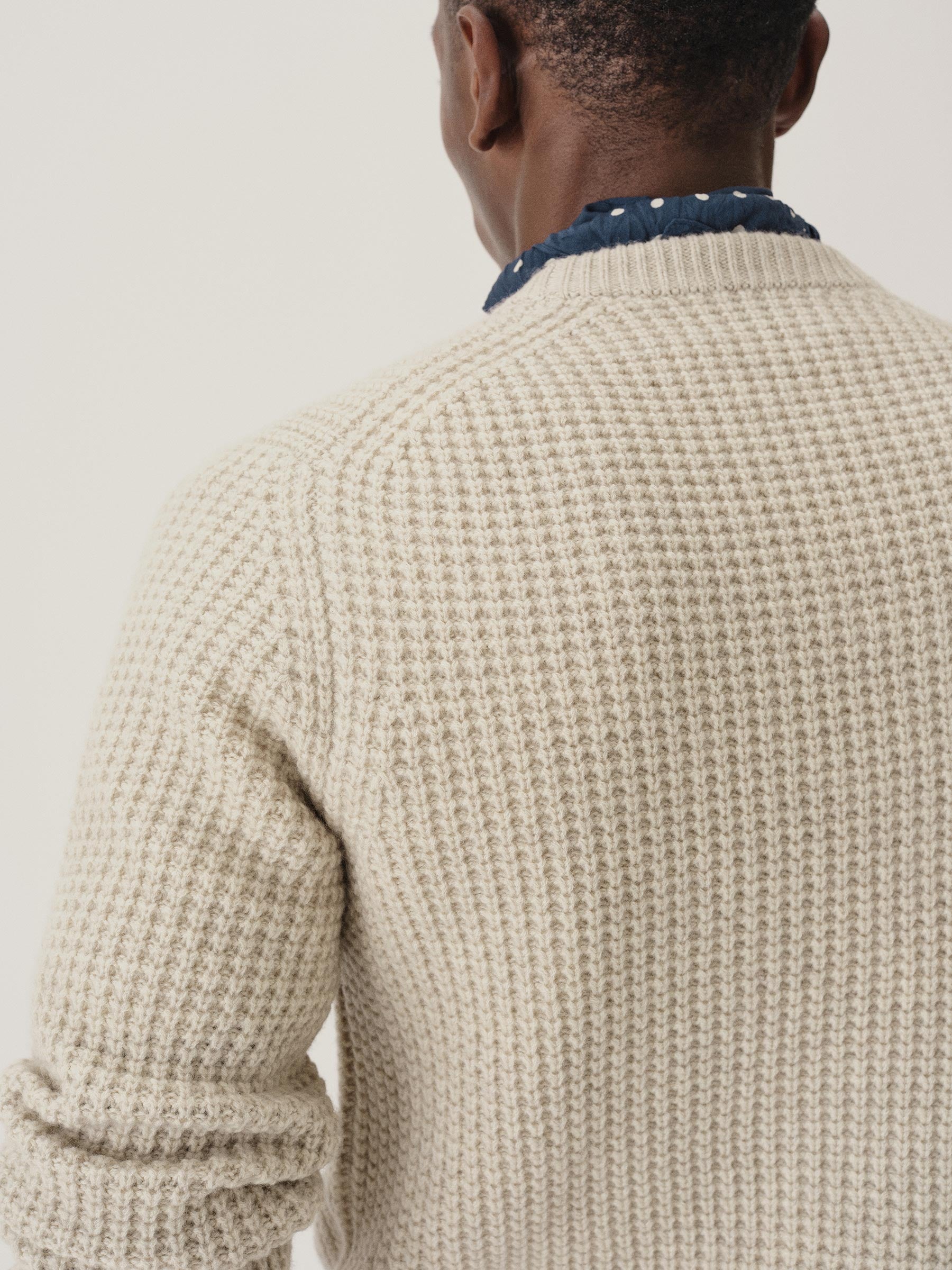Classic crewneck knit from 5 gauge wool: a chunky, substantial yarn that’s soft to the touch.