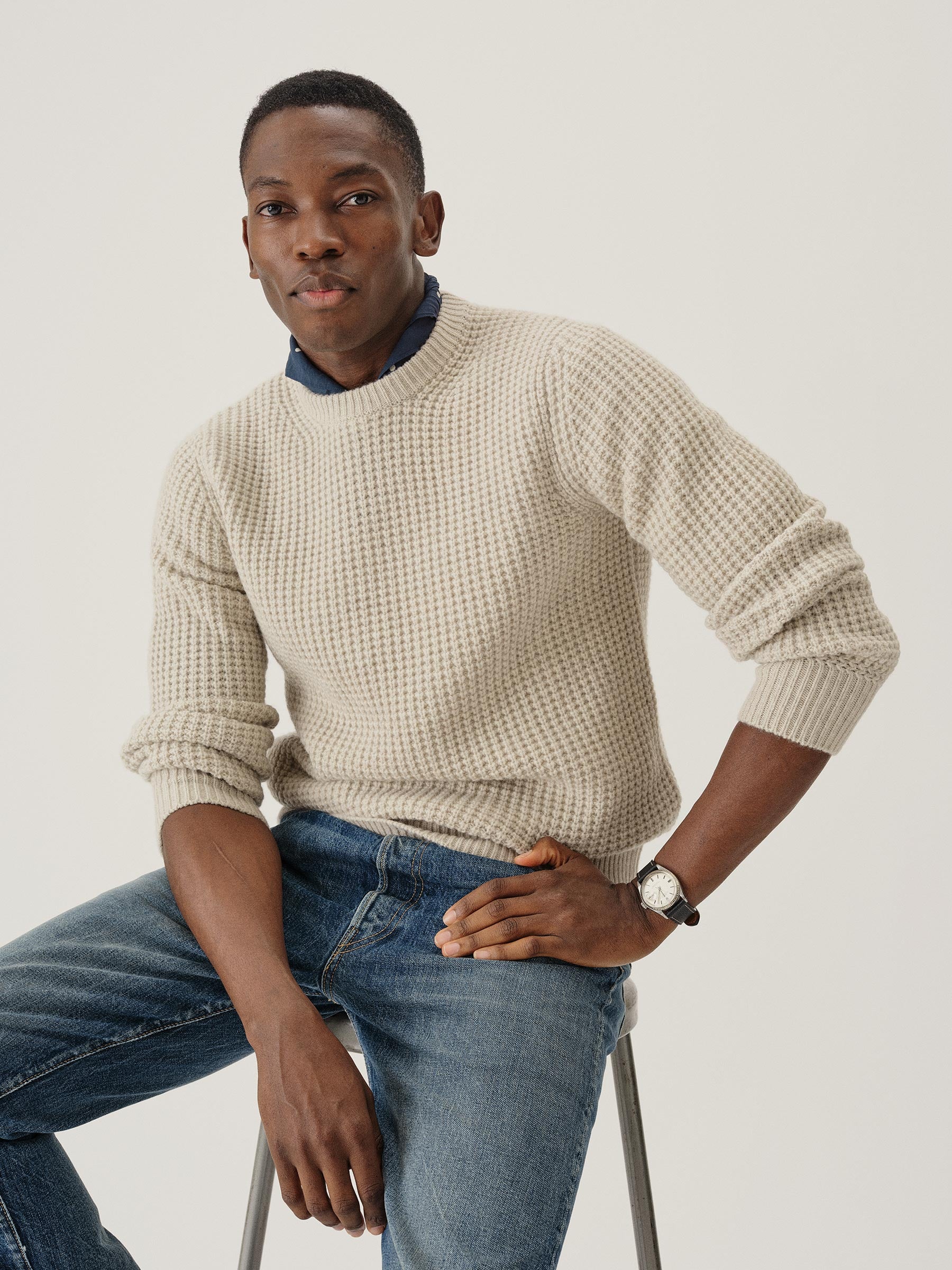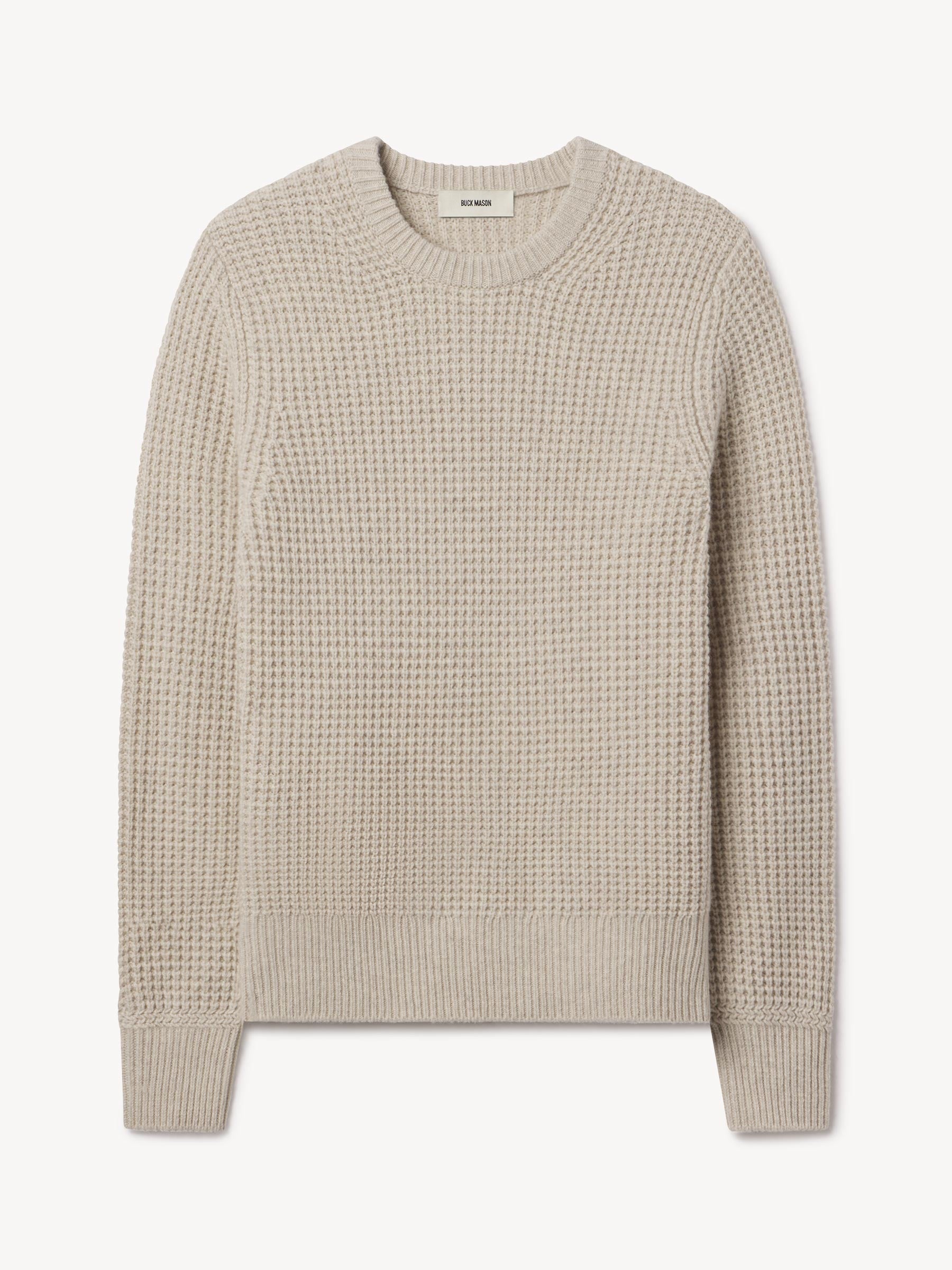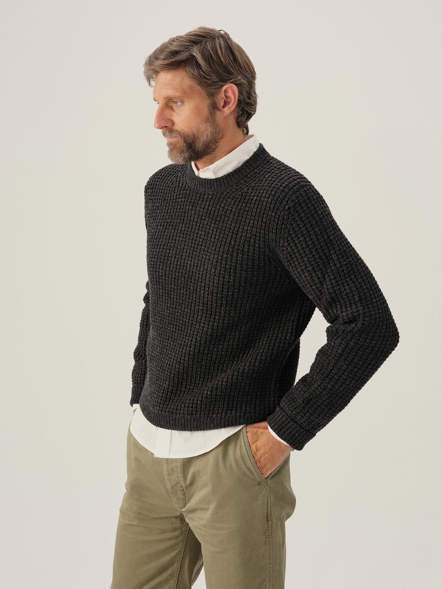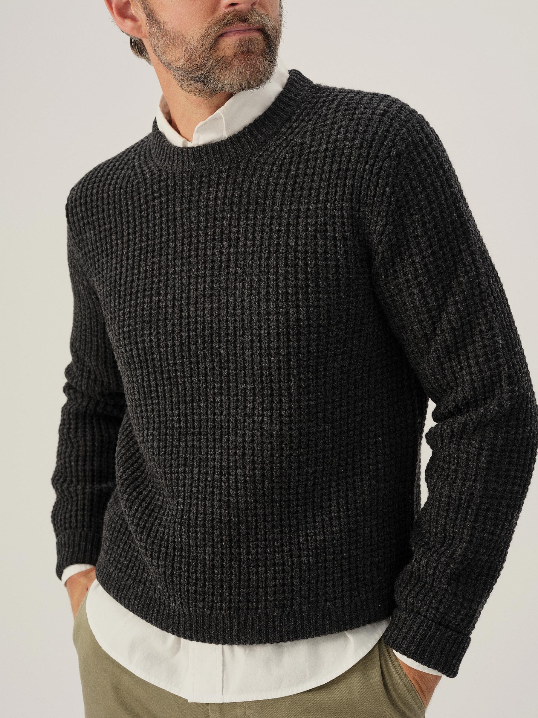 Classic crewneck knit from 5 gauge wool: a chunky, substantial yarn that’s soft to the touch.