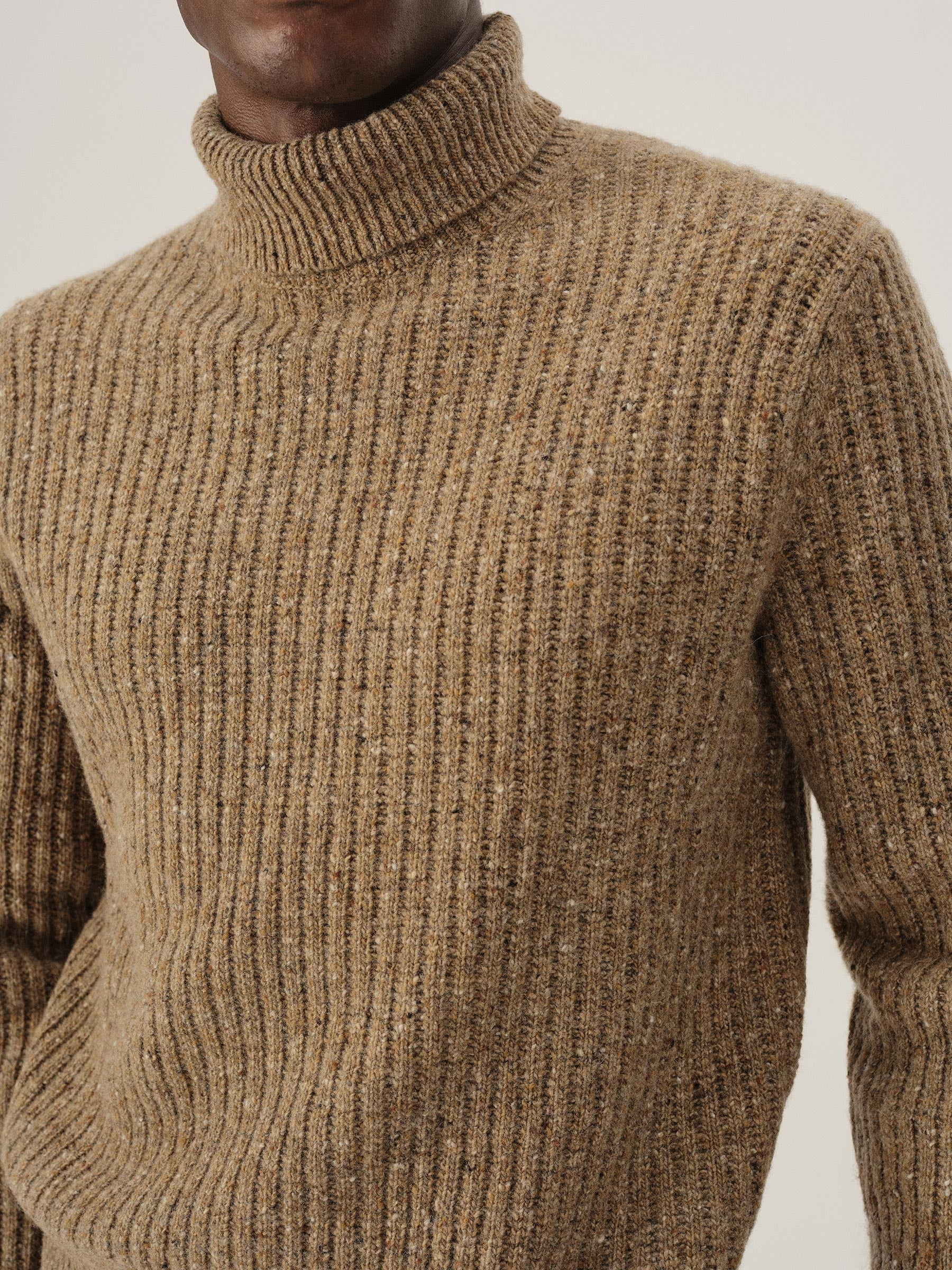 Rib-knit turtleneck in fine Donegal-flecked Italian wool blend that makes layering a breeze.