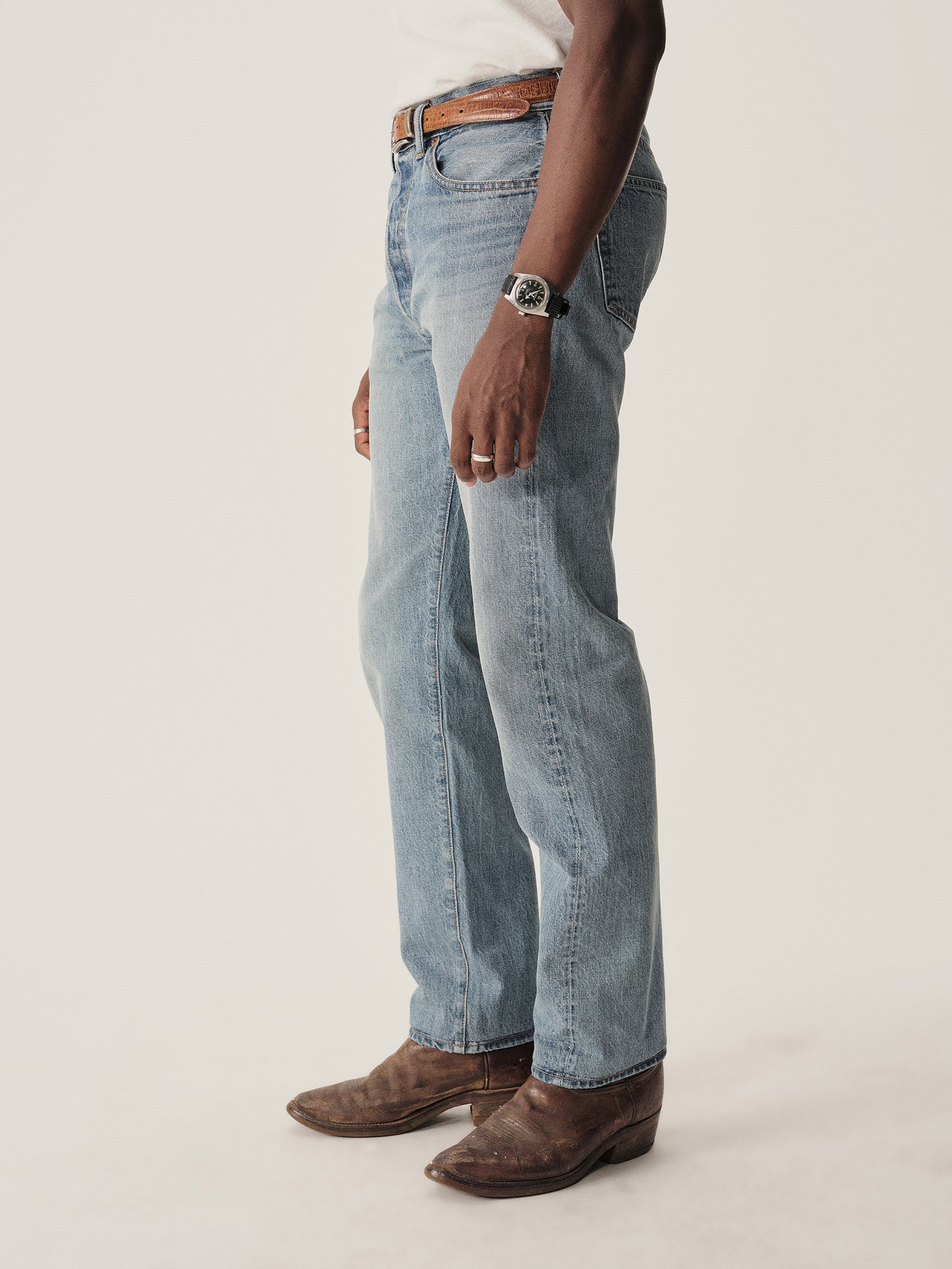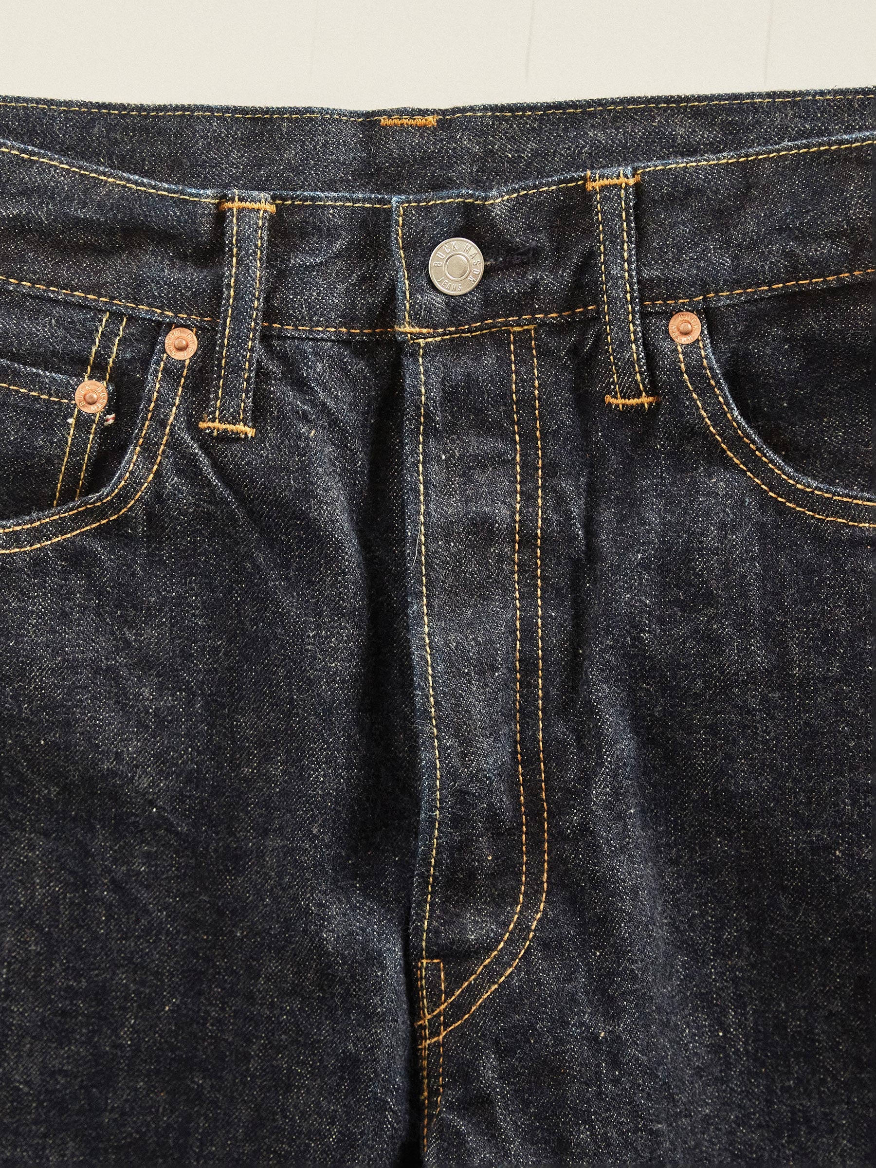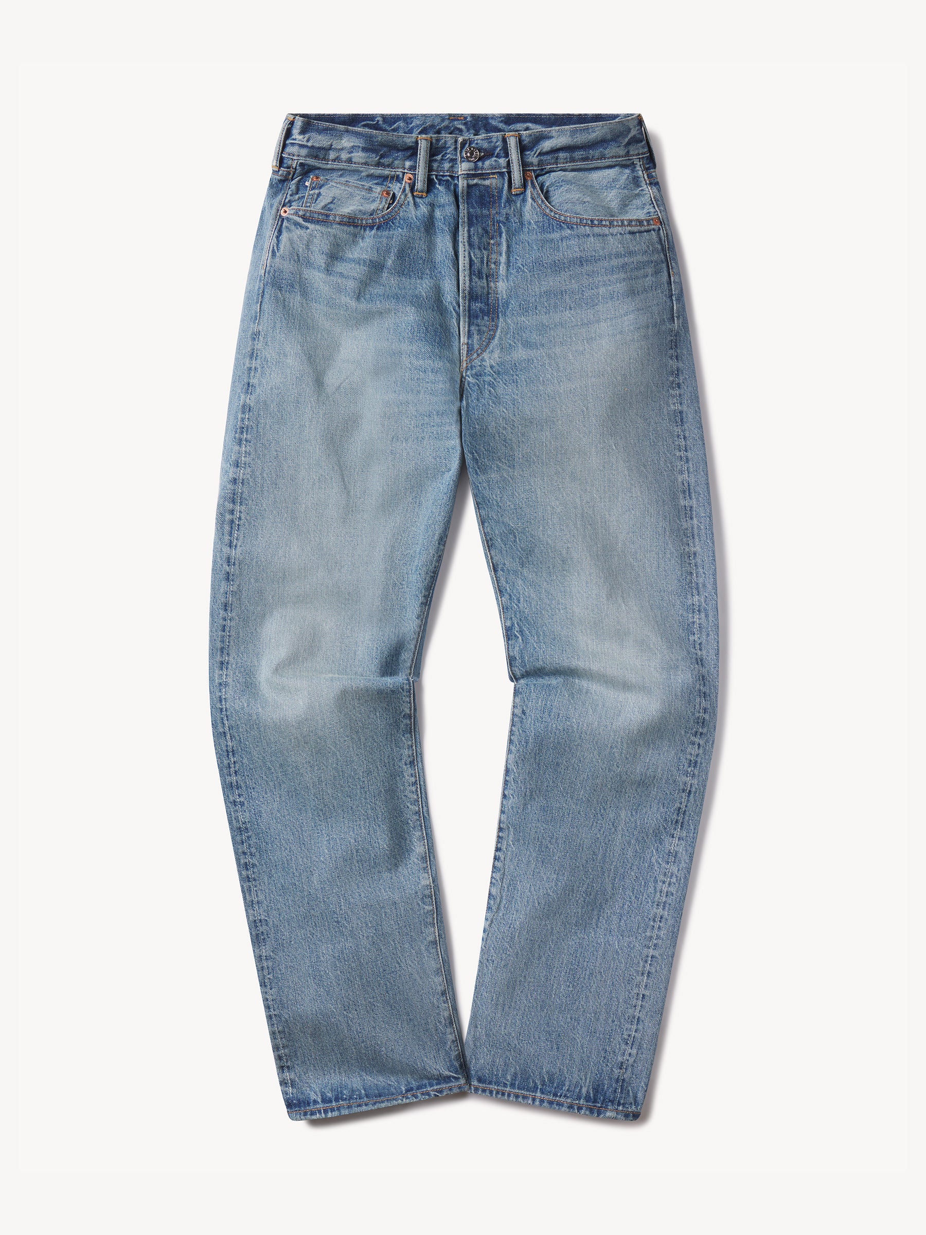 Vintage-inspired, unsanforized selvedge denim in a slightly higher-rise with a tailored fit through the thigh and leg. Button fly. Washed to control shrinkage.