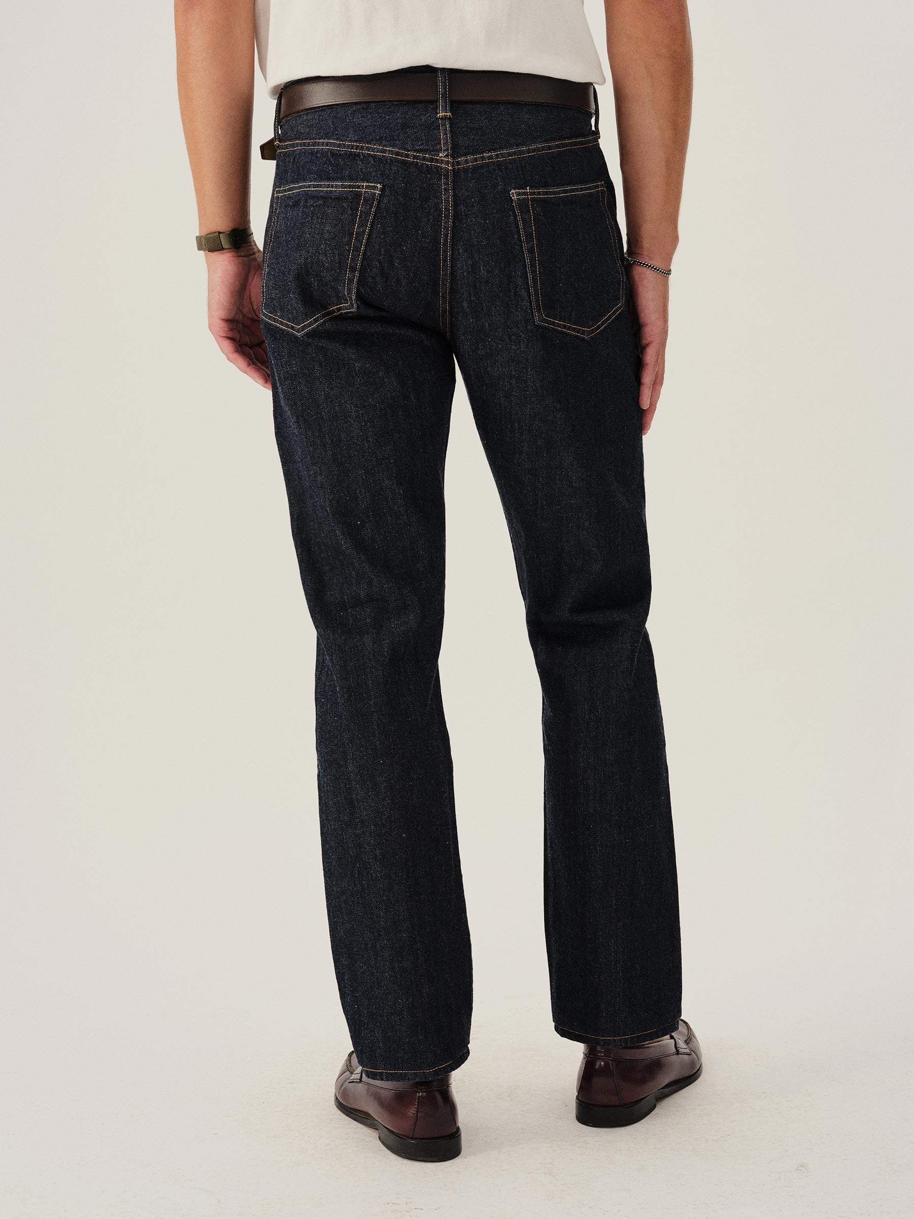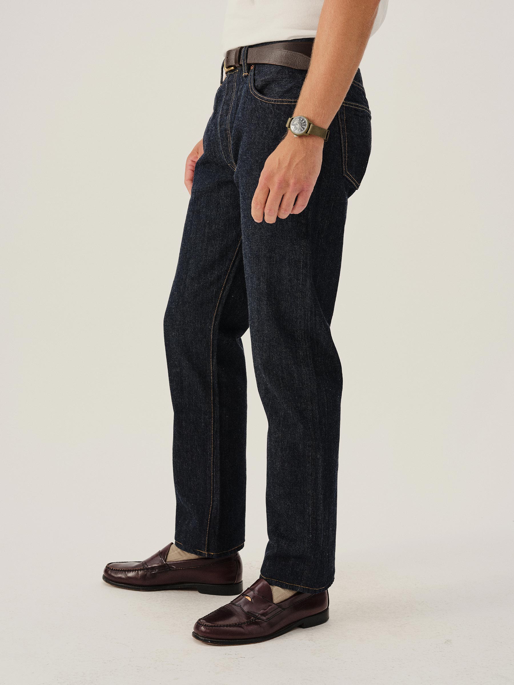 Vintage-inspired, unsanforized selvedge denim in a mid-rise with an easy straight fit that tapers below the knee. Button fly. Washed to control shrinkage.