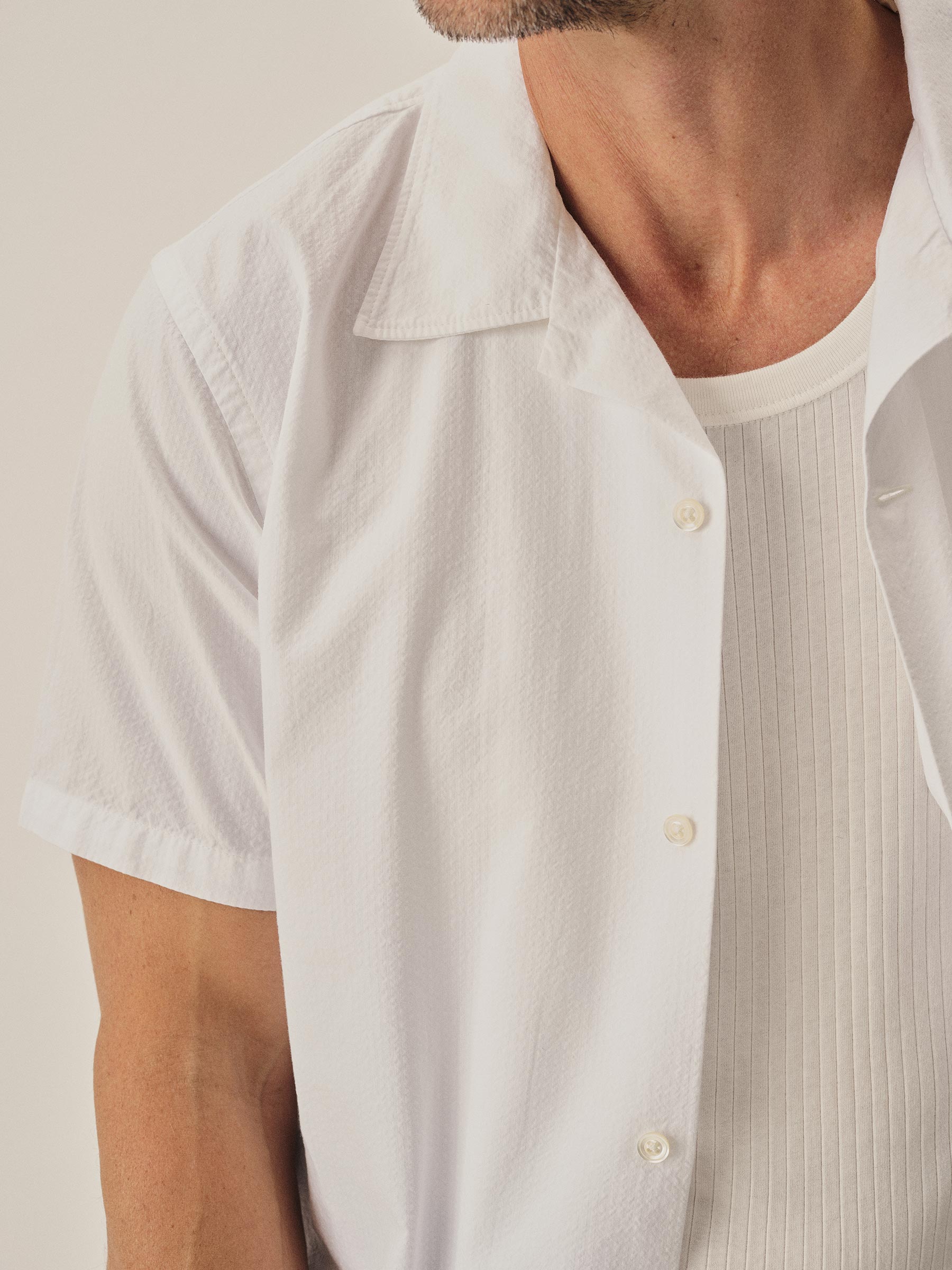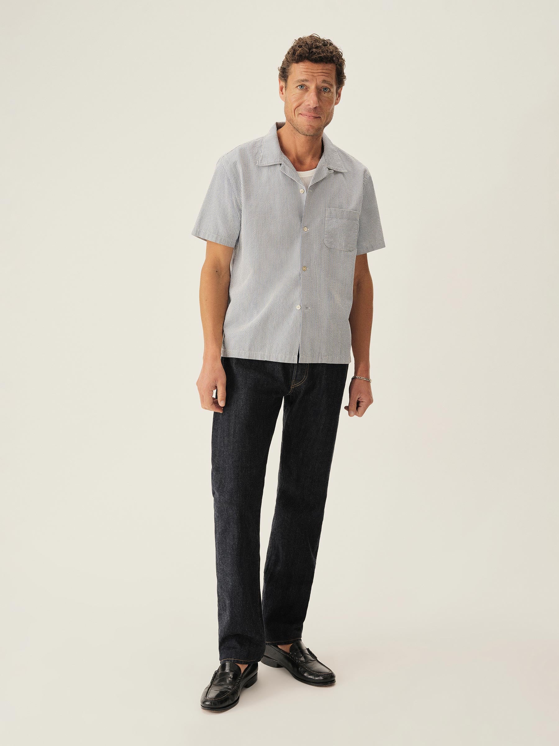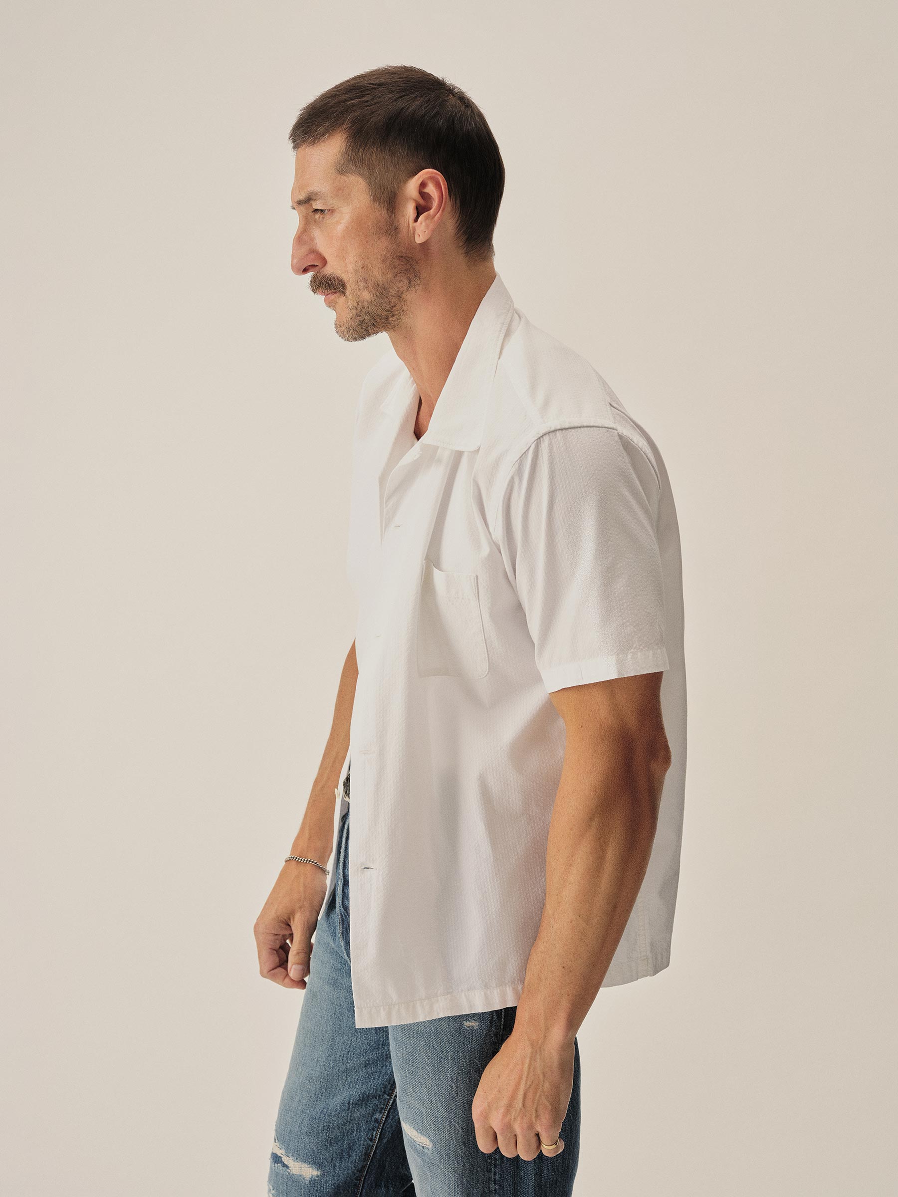 A relaxed, airy one pocket seersucker camp shirt cut in a boxy fit.