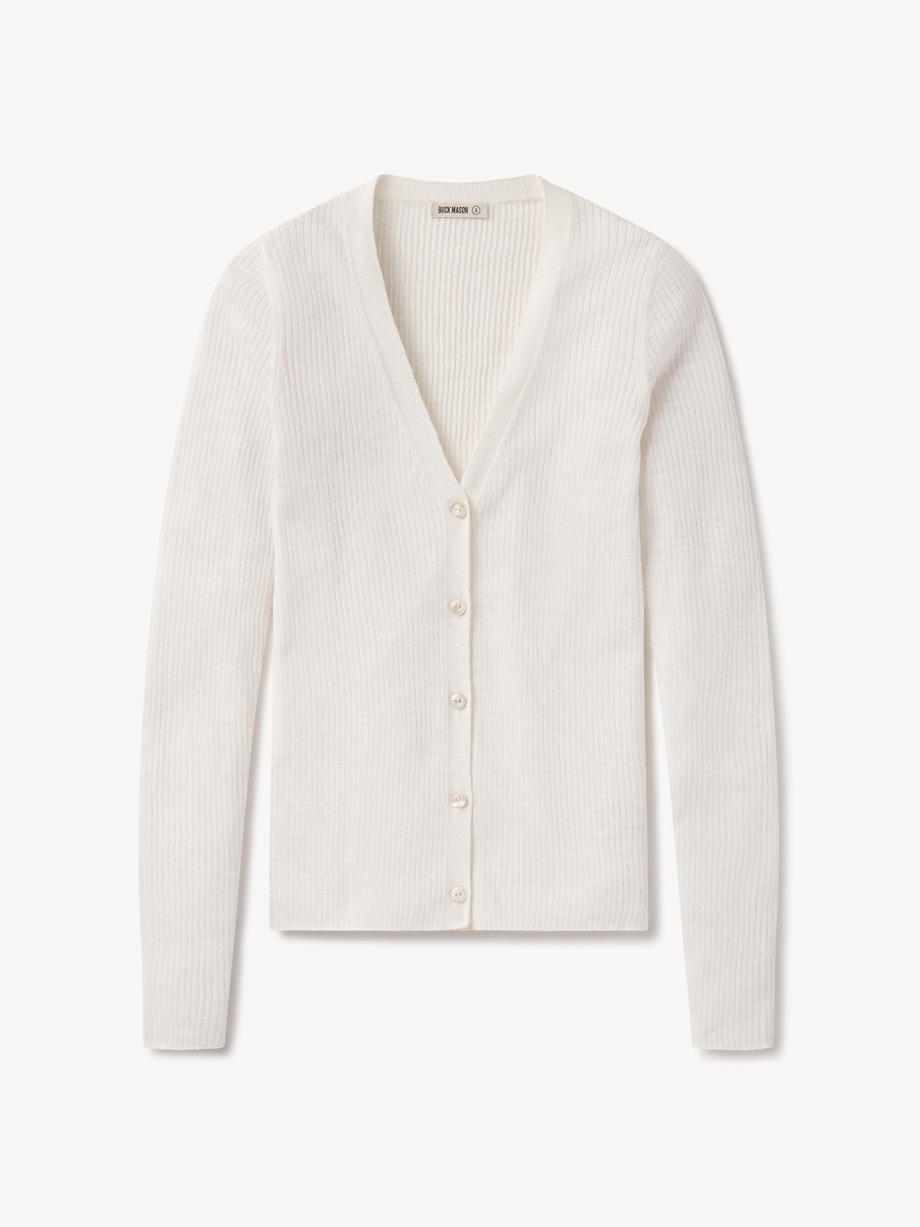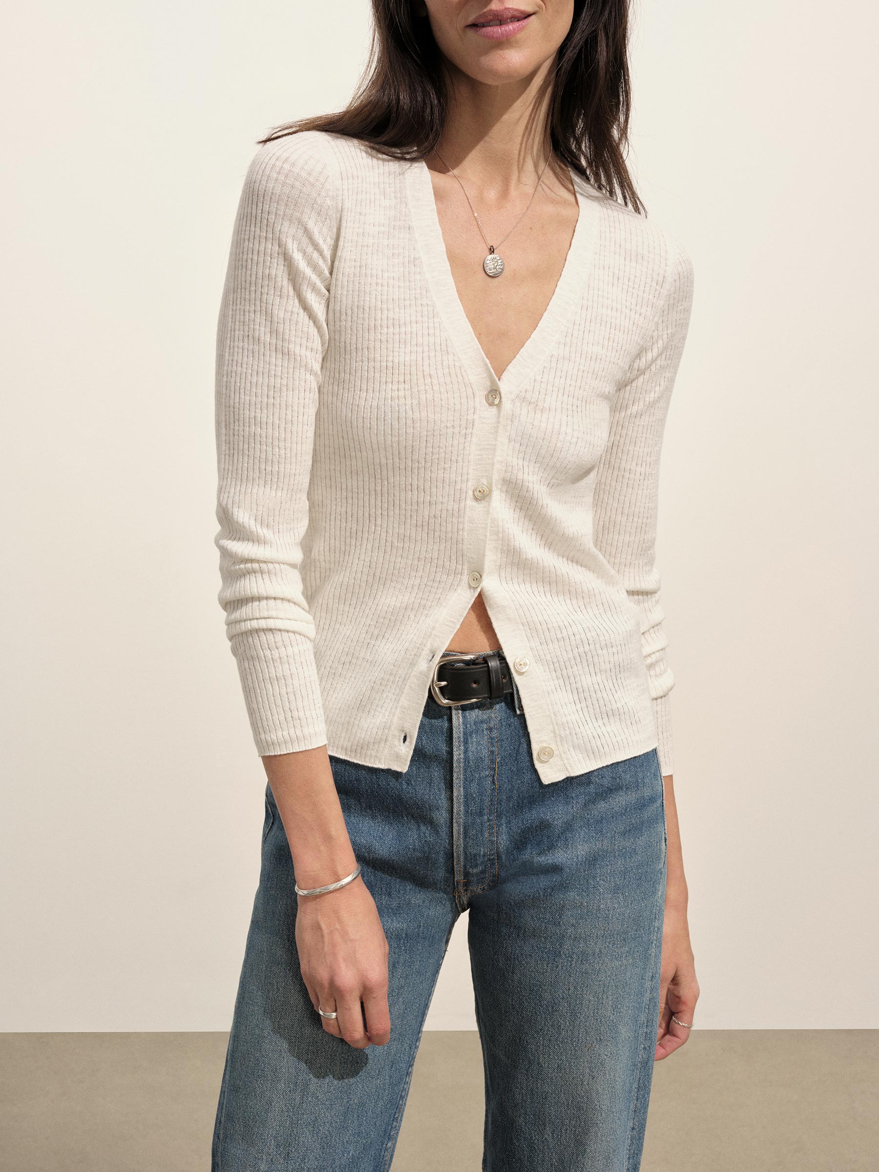 Slim fit V-neck cardigan in a 14 gauge linen blend with light slub texture.