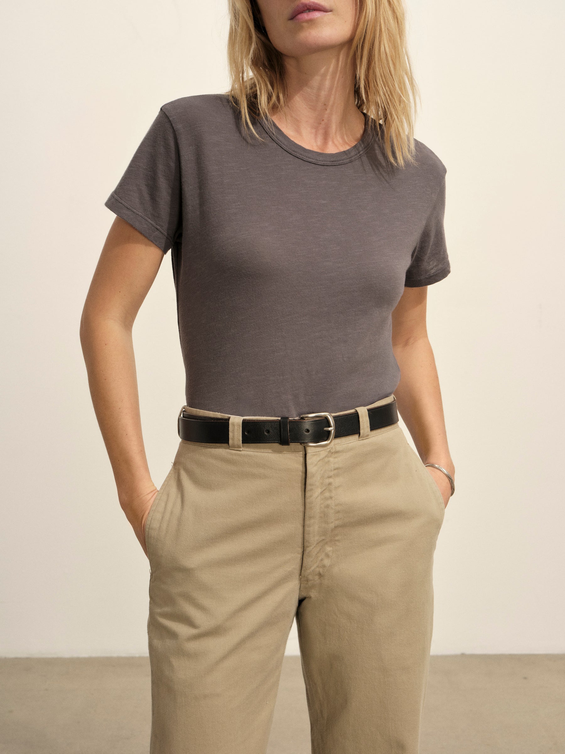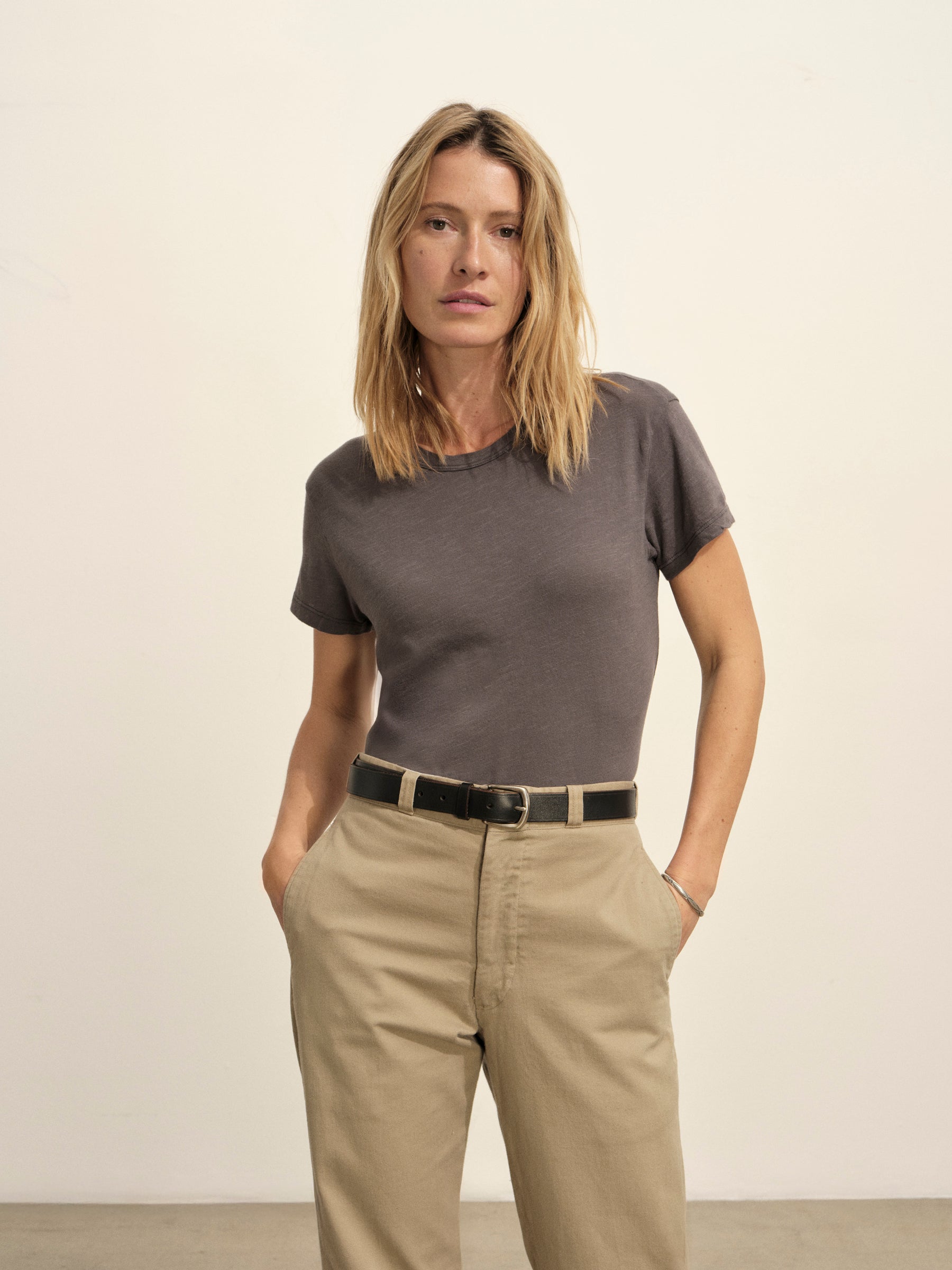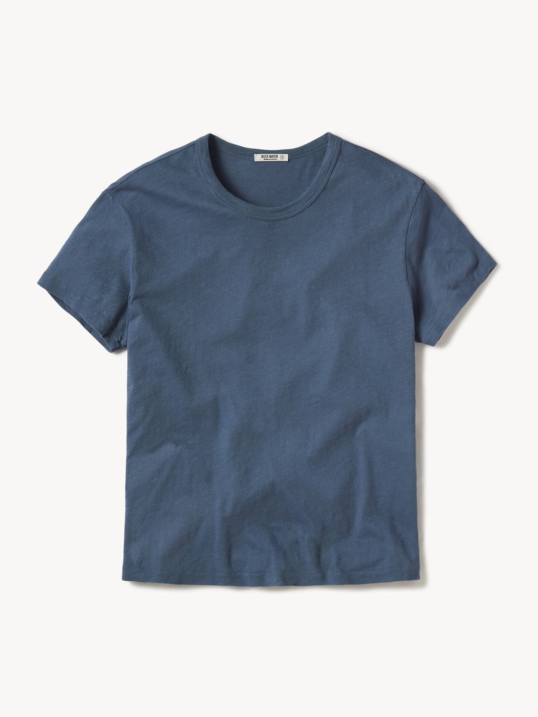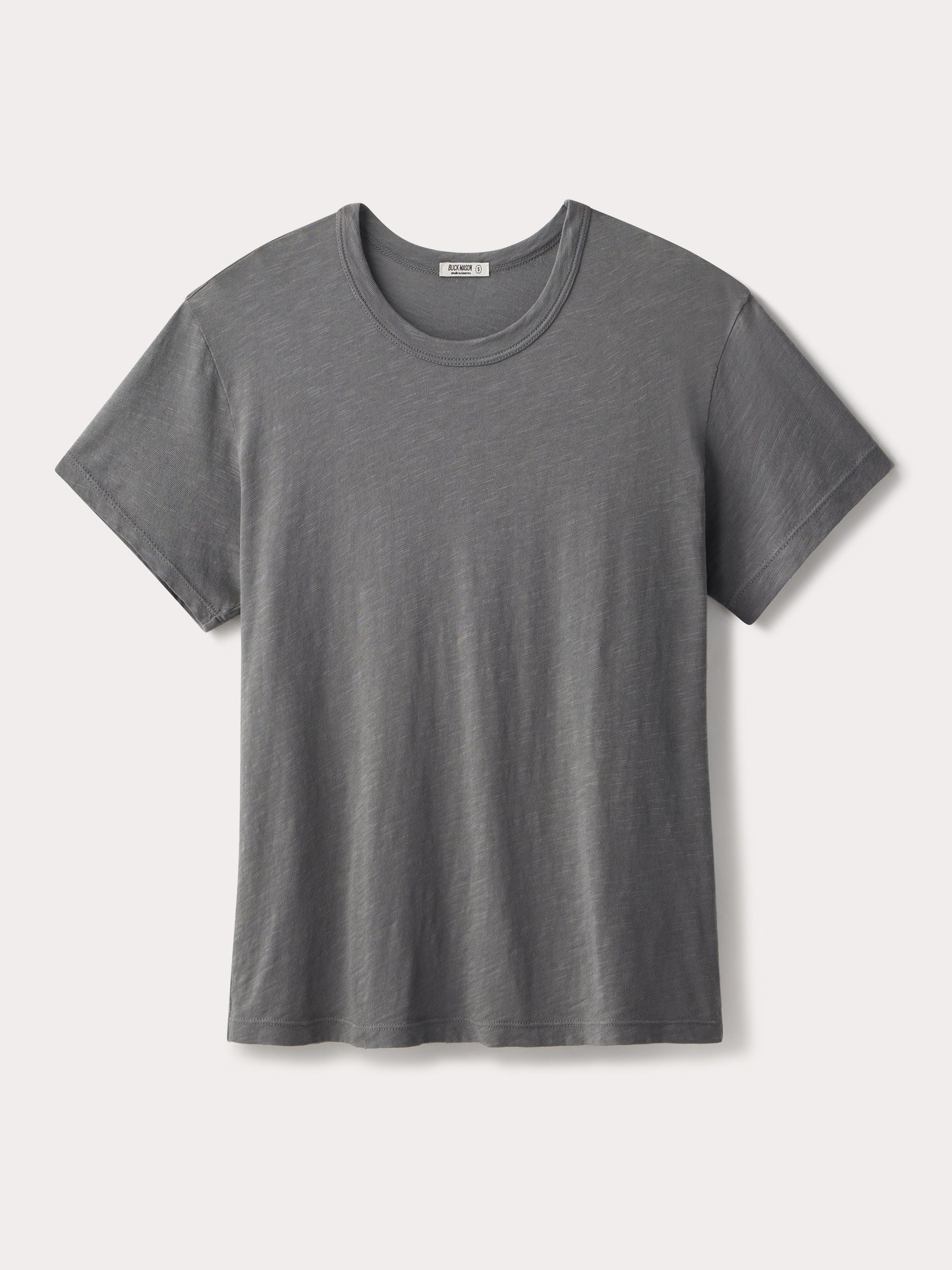 Classic fit short sleeve crewneck tee with a straight hem, cut from a lightweight slub cotton.