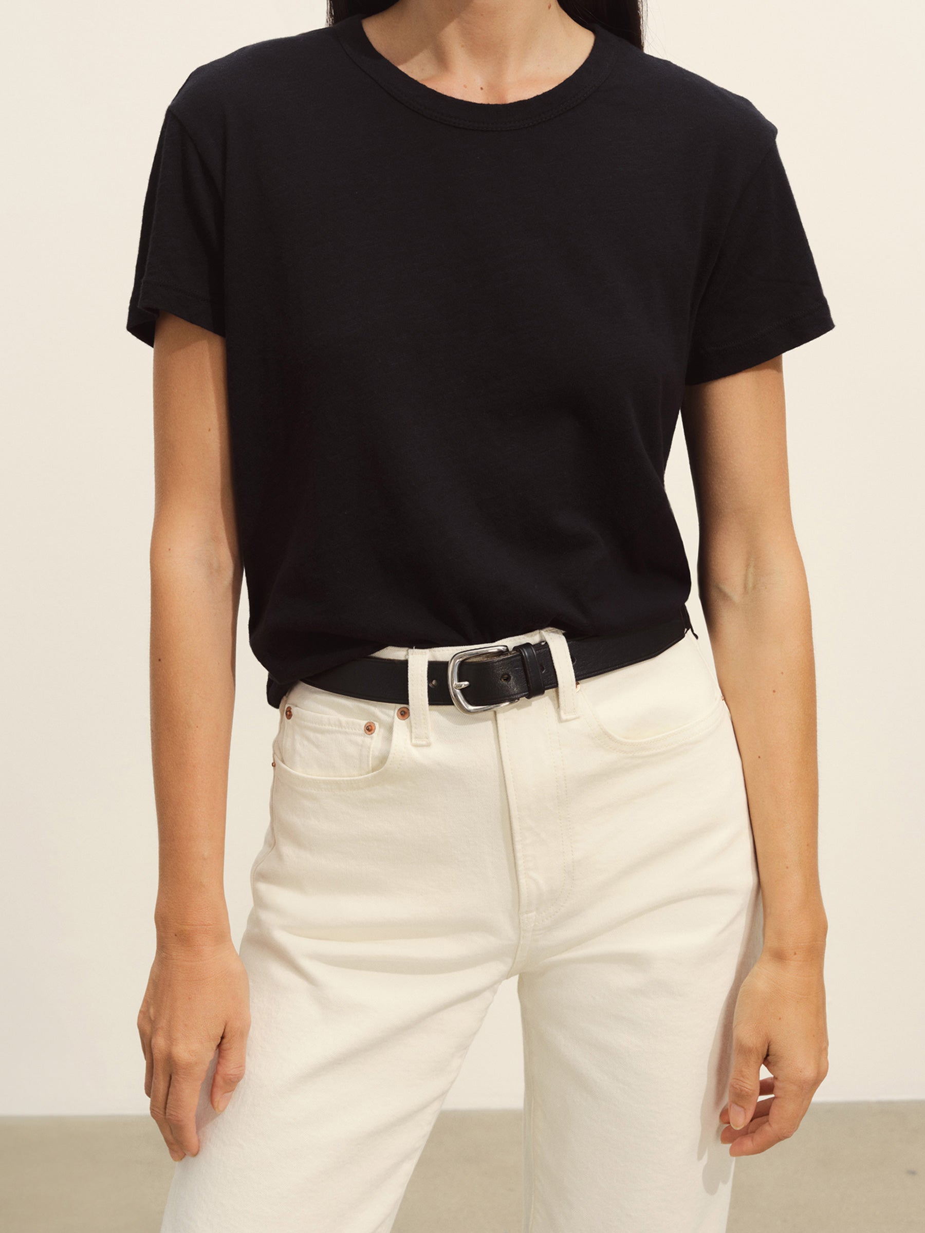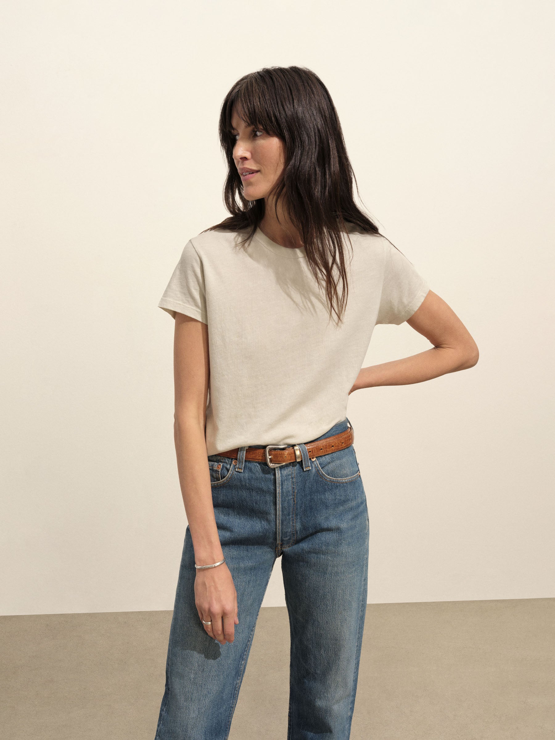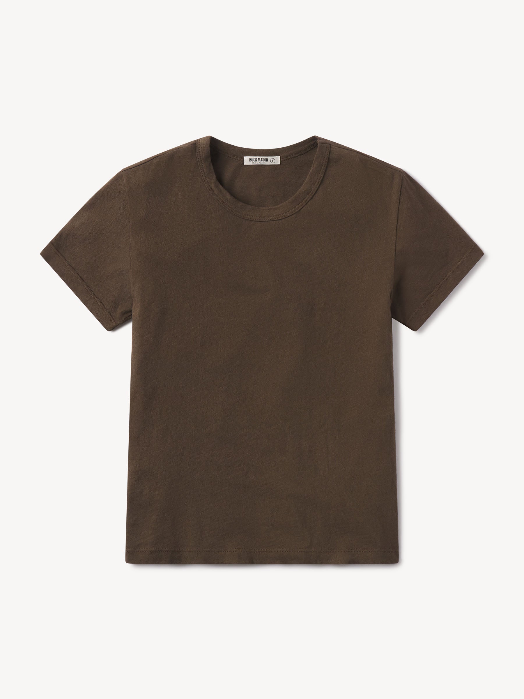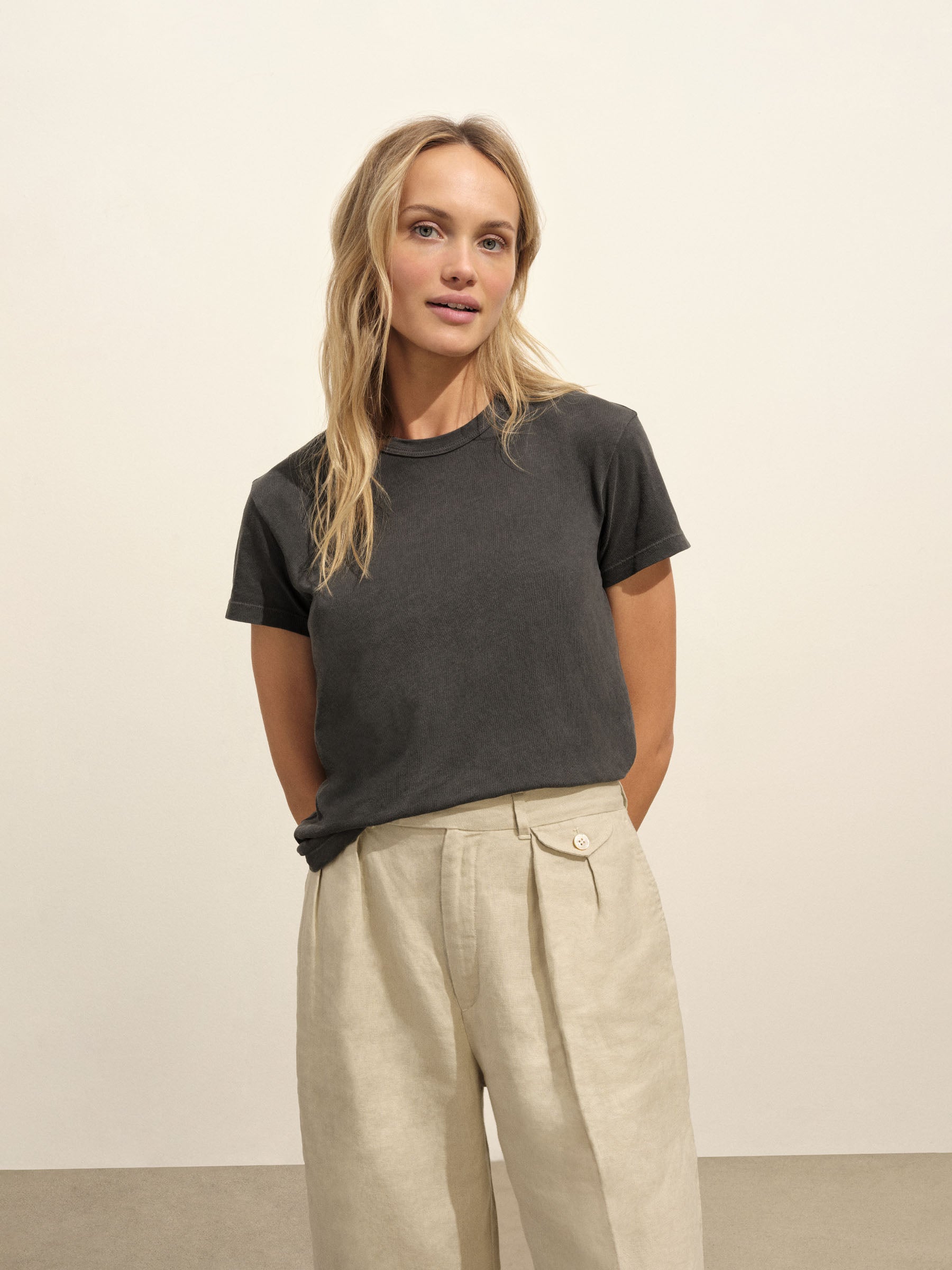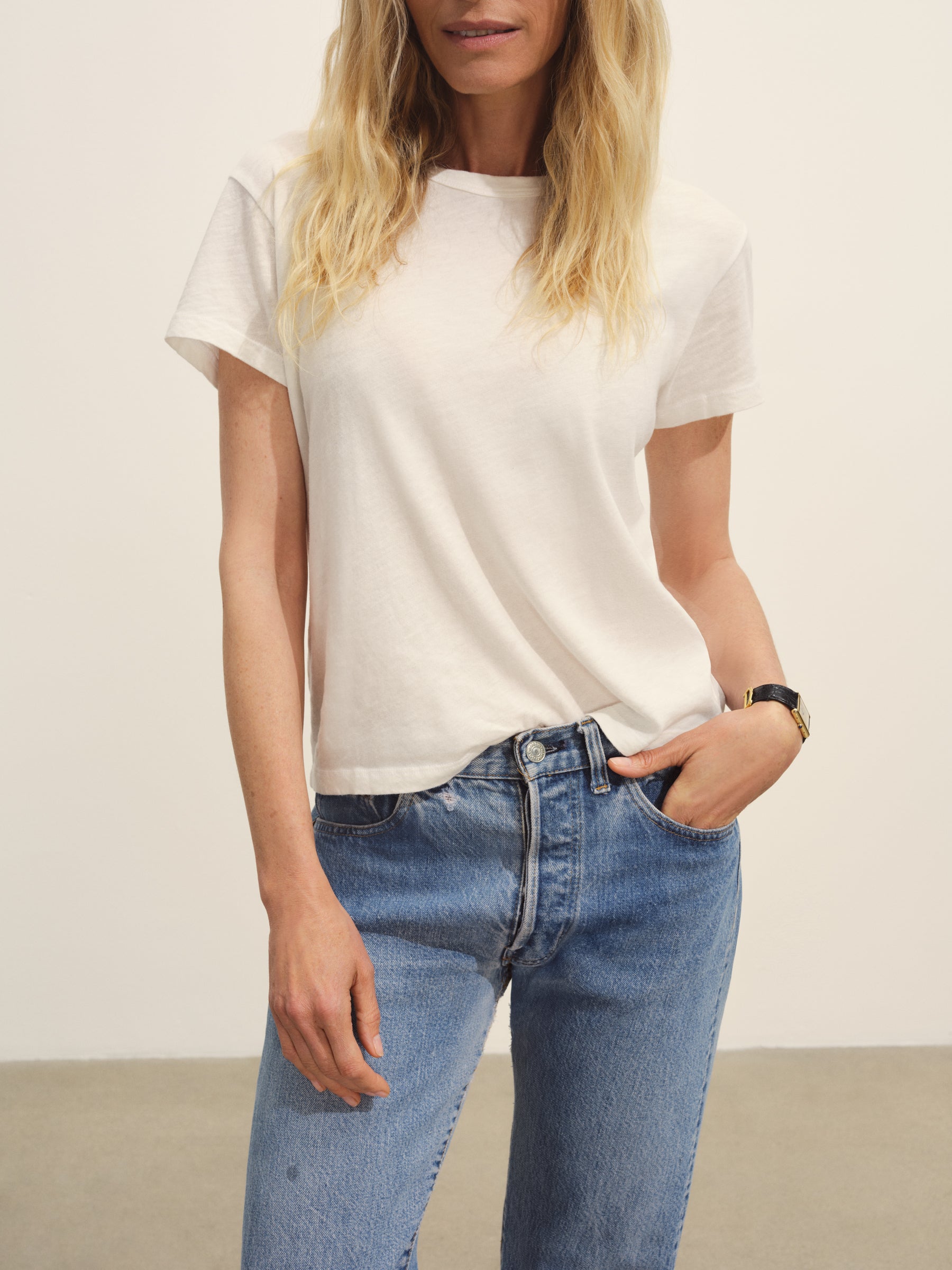 Classic fit short sleeve crewneck tee with a straight hem, cut from a lightweight slub cotton.